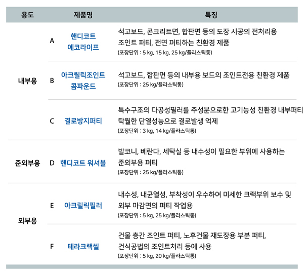 | 핸디코트 결로방지 퍼티 | 내부용. 지하 등 결로 발생 부위. 창고 등 습기 많은 부위 | 결로방지 곰팡이 방지 효과 | 얇게 바르기 어렵다. 접착력이 떨어진다. 마르는데 오래 걸린다. |