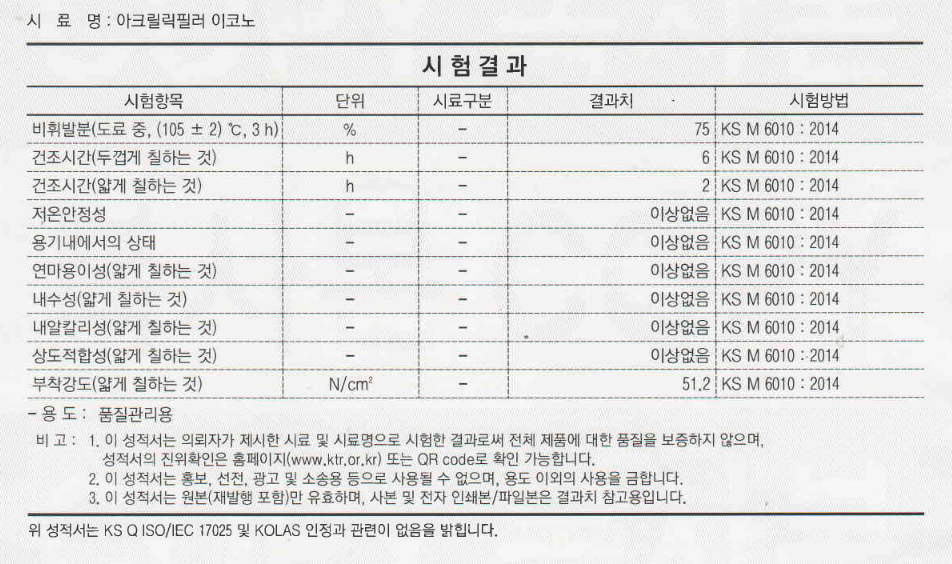 (출처: 핸디코트 아크릴릭필러E 시험성적서)