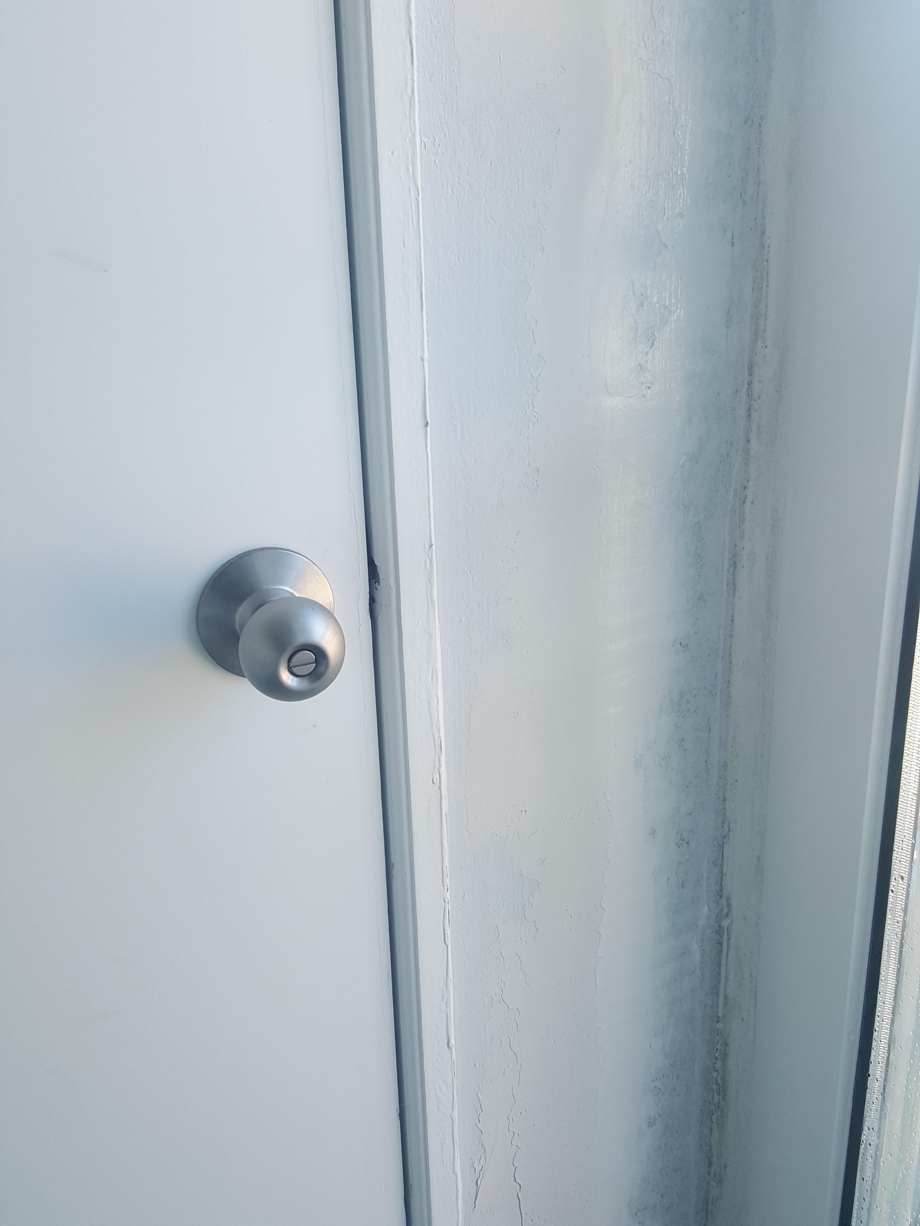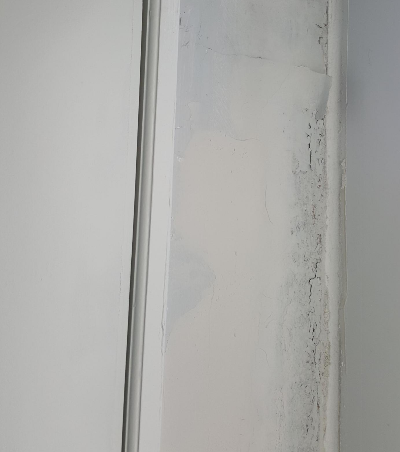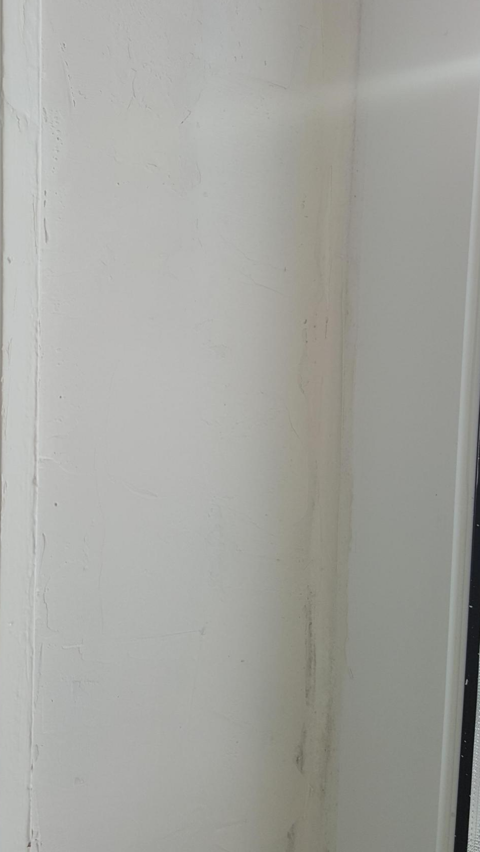 옆에 시커멓게 곰팡이가 생겼다. 벽을 잘 보면 결로로 젖어 있는 것을 알 수 있다. 핸디코트를 바른 부분은 곰팡이가 생기지 않았다.